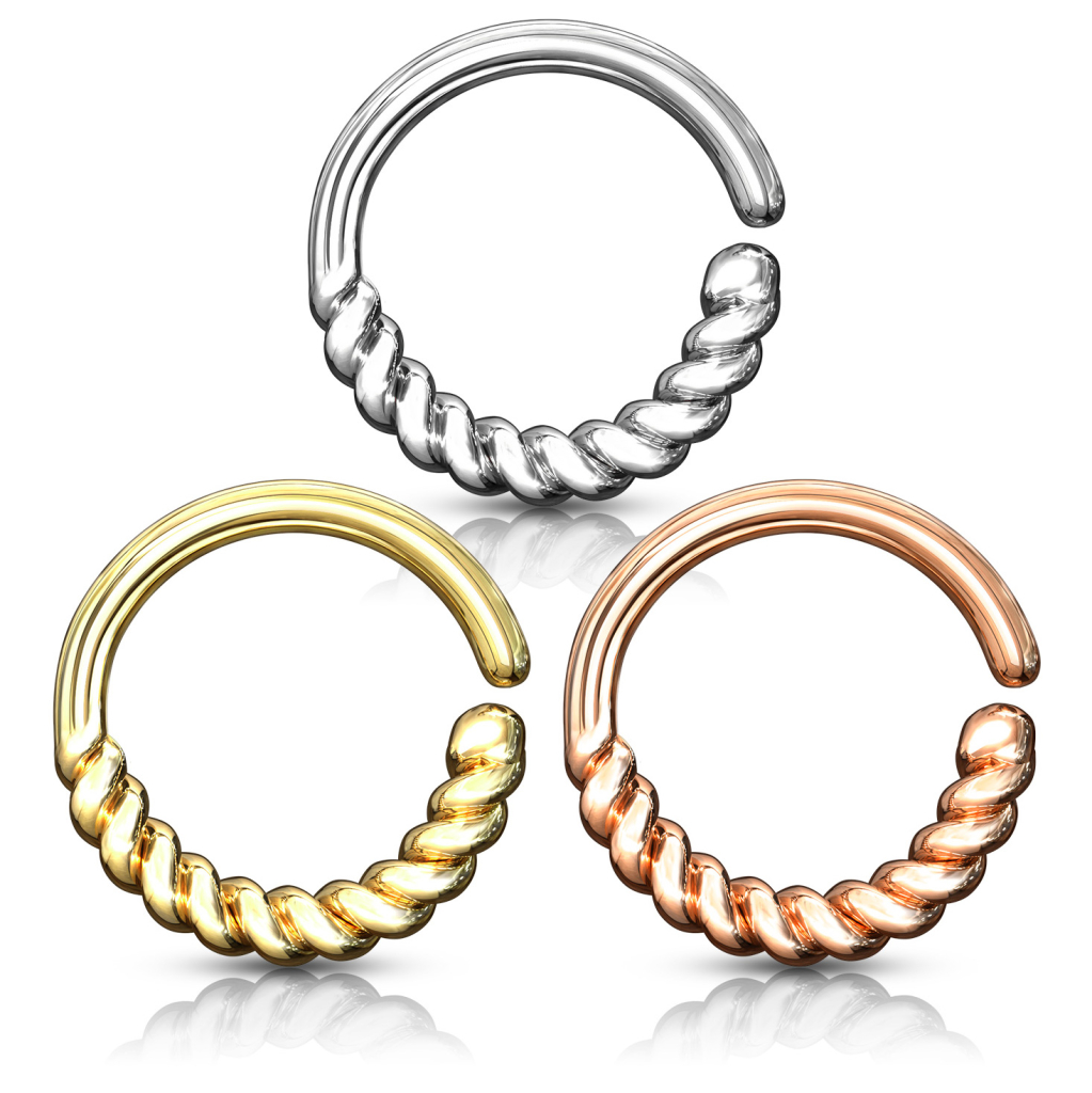 Šperk, který vidíte na obrázku je z jedné části hladký a ve spodním půlkruhu je zapletený. Kroužek je vyroben z jednoho kusu kovu, takže když si ho chcete nasadit, musíte jeho konce zkroutit do opačné strany - nemusíte si dělat hlavu s žádným uzavíracím mechanismem.