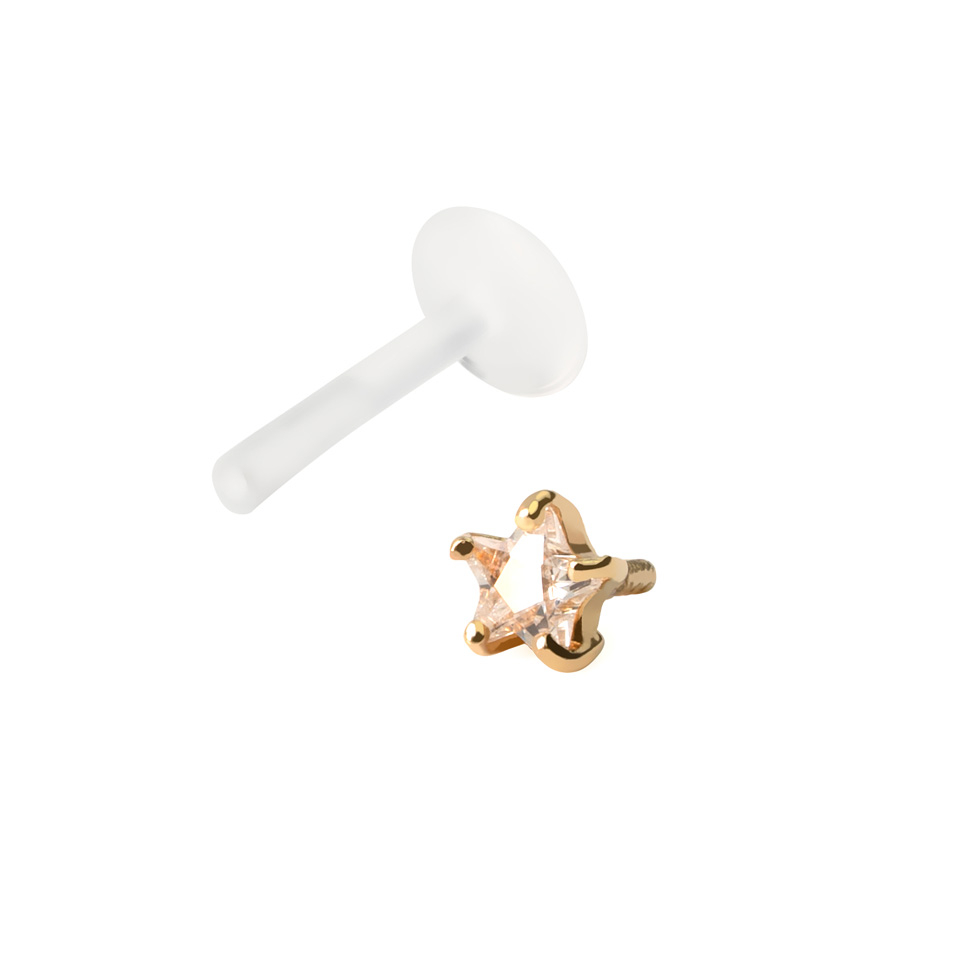 Zlatá 14kt labreta s kamínkem ve tvaru hvězdy a PTFE tyčinkou