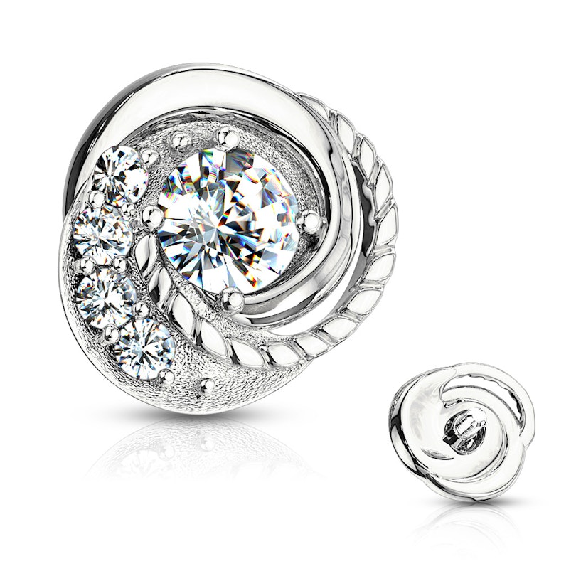 Tento mikrodermál patří mezi nejzajímavější, protože má spoustu úchvatných prvků. Na jedné straně můžete najít krásný pletený vzor, který začíná z kraje a pokračuje směrem ke středu. Na druhé straně najdete řadu několika kamínků, která také směřuje ke středu. V neposlední řadě se uprostřed vyjímá krásný velký jiskřivý kamínek, který dodává šperku špičkový nádech.