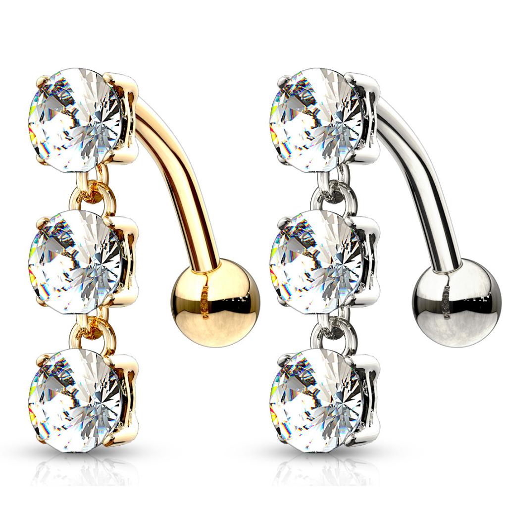 Název: Zlatý 14kt obrácený piercing do pupíku se třemi zirkony