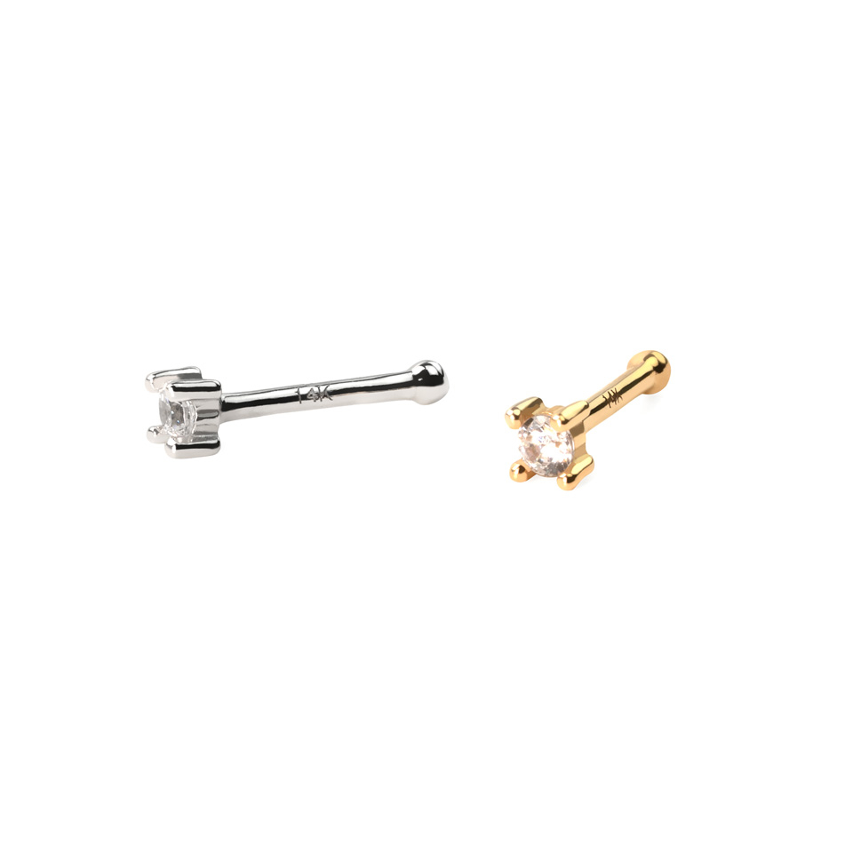 Právě jste klikli na rovný piercing do nosu, který je zdobený krásným broušeným kamínkem. Tento piercing není jako každý jiný, protože je vyroben z ryzího 14 karátového zlata a můžete ho také získat v 14 karátovém bílém zlatě.