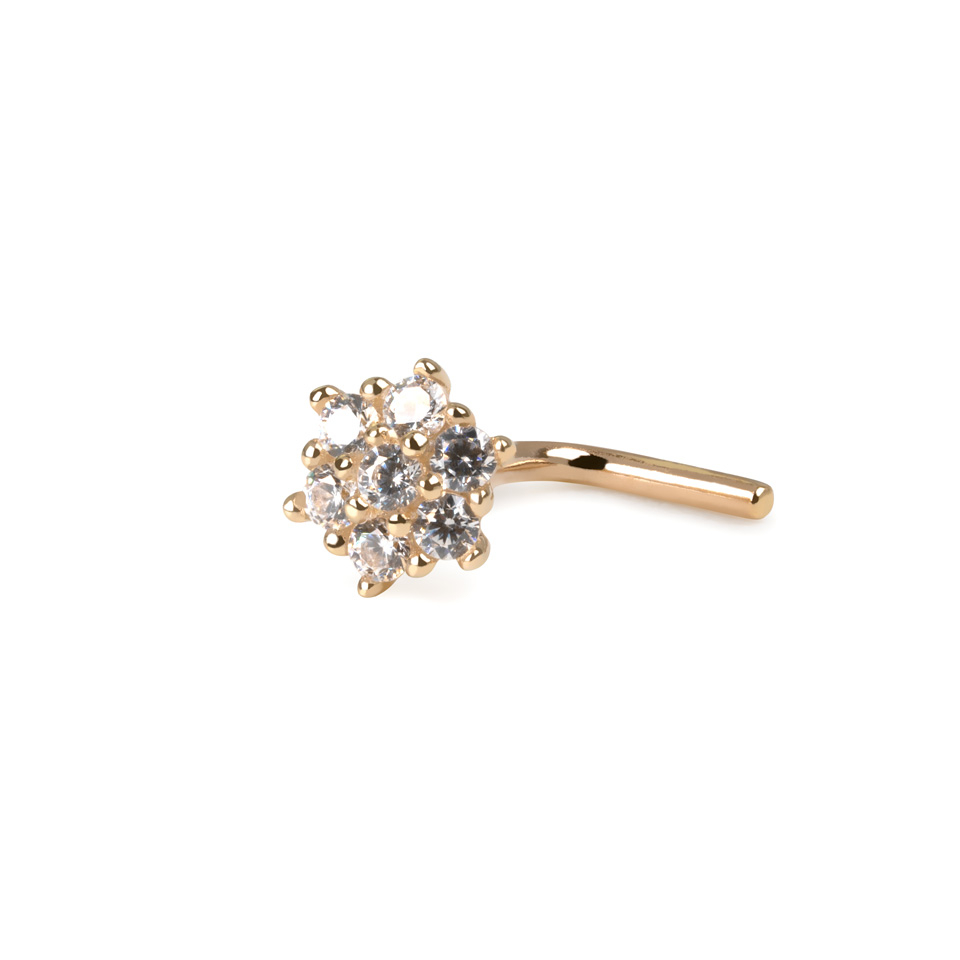 Zlatý 14kt piercing do nosu zahnutý do "L" s květinou z kamínků