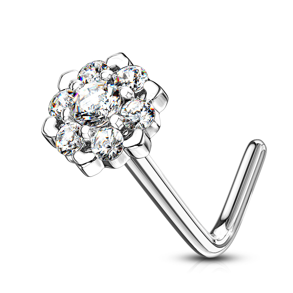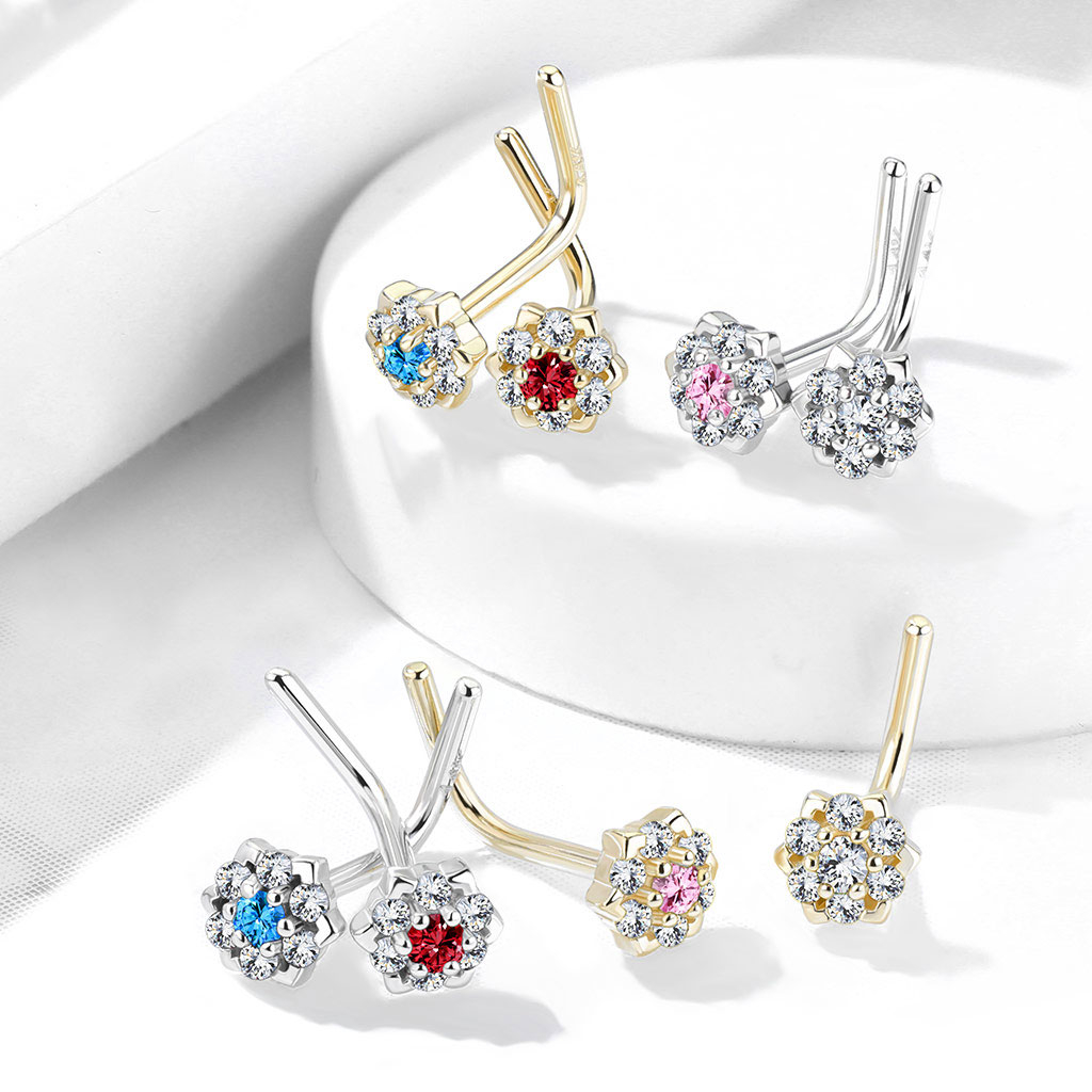 Zlatý 14kt piercing do nosu zahnutý do "L" s lotosovým květem zdobeným kamínky