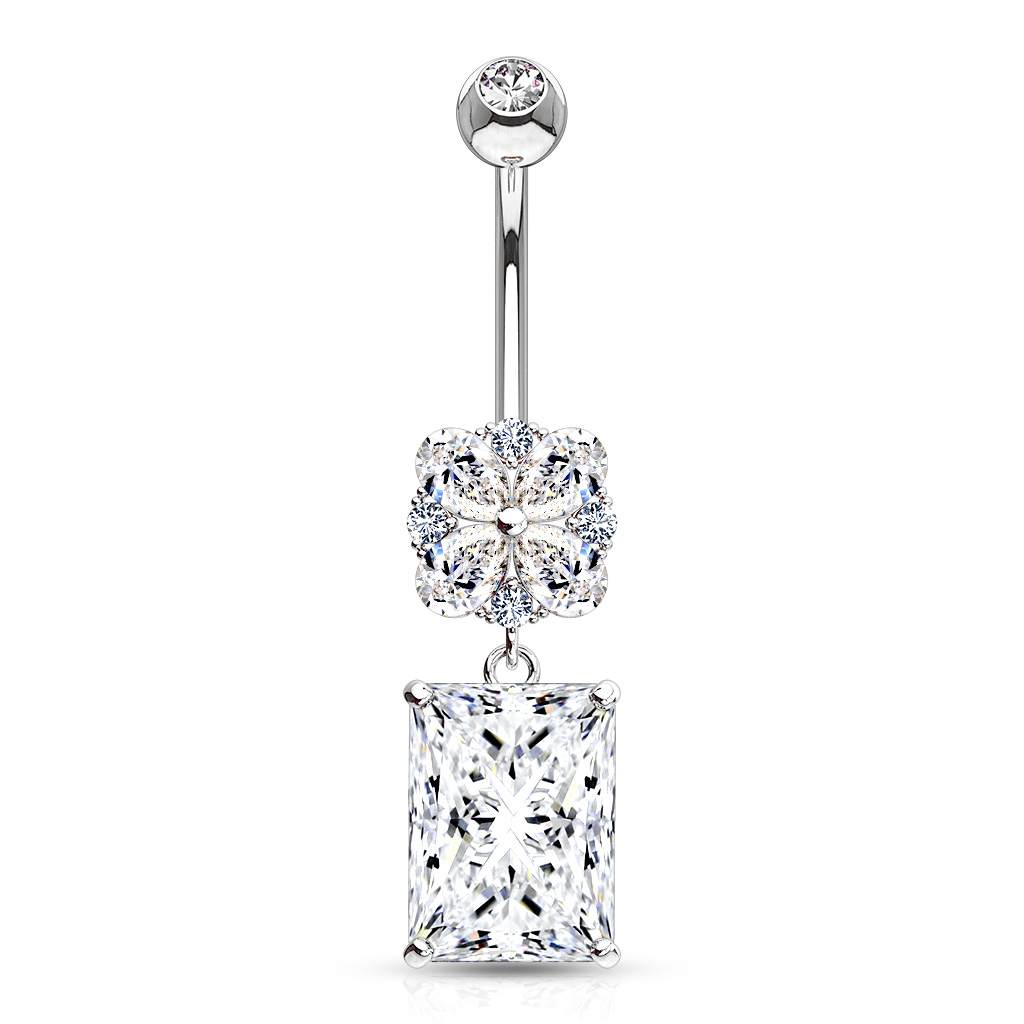 Představujeme Vám tento krásný a elegantní piercing do pupíku ze 14-karátového zlata, který jako by přišel ze světa pohádek a princezen. Je ozdoben velkým obdélníkovým kamínkem speciálního řezu. Tento řez je okolo 100 let starý, a byl vytvořen když byli bratři Asscherovi najati nizozemskou královskou rodinou na opracování největšího diamantu světa. Toto opracování je speciální v tom, že má rovné linie a sestává z několika vrstev, které pomáhají docílit maximálního třpytu.