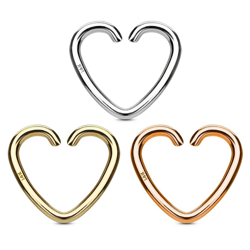 Toto krásné srdíčko je vyrobené z kvalitního 14-karátového zlata. Je vyrobené z jednoho kusu kovu, který byl vytvarovaný do tvaru srdce. Konce kovu se setkávají uprostřed srdce, a mají mezi sebou 2mm mezeru. Před nasazením budete muset od sebe konce odtáhnout takovým způsobem, jako byste je od sebe chtěli odtočit. Nesnažte se je od sebe odtáhnout horizontálně ať nepoškodíte elasticitu šperku. Po nasazení je potřeba uvést šperk do původního stavu.
