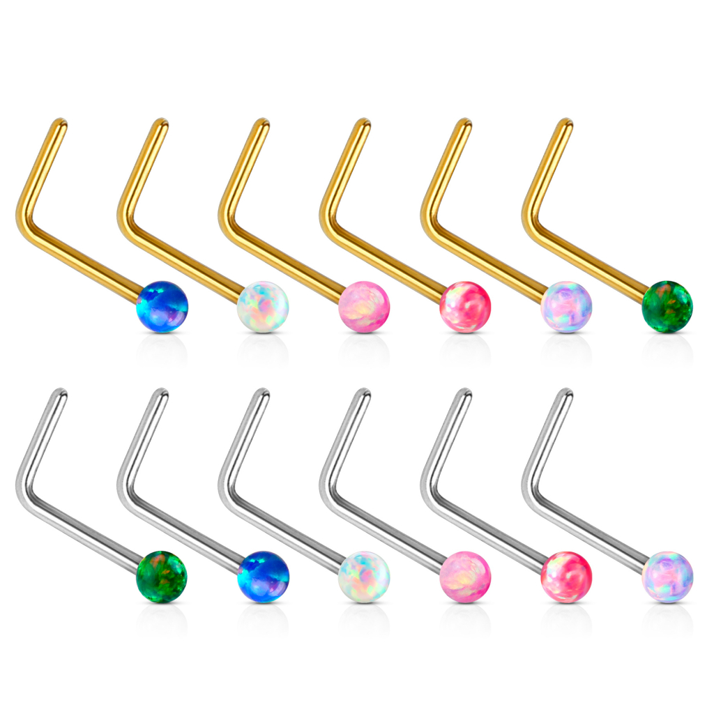 Tento piercing do nosu je vyroben z 14 karátového zlata a vy si můžete vybrat mezi bílým nebo klasickým žlutým zlatem. Oba modely obsahují stejné množství zlata, takže cena je také stejná. Společné mají také to, že na vrcholu drží úchvatný opálový kamínek. Nejedná se o přírodní opál, ale o syntetický kamínek, vyrobený ze směsi pryskyřice. Kromě barvy tyčinky si můžete vybrat také preferovanou barvu opálového kamínku.