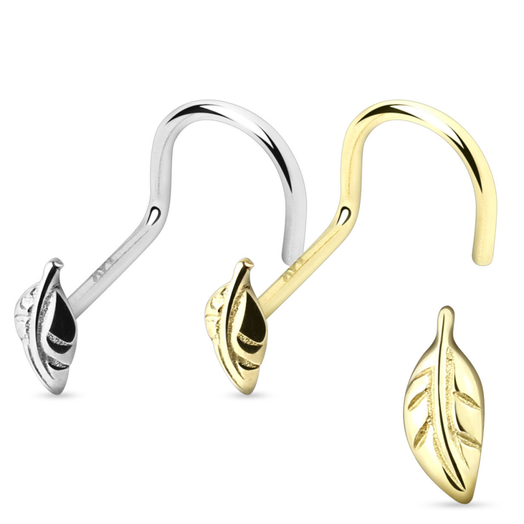 Zlatý 14kt zahnutý piercing do nosu s listem